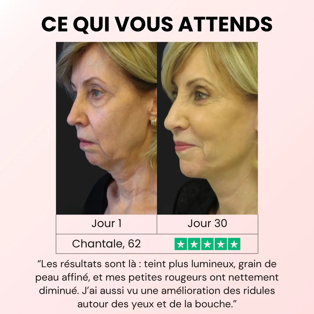 Beaucoup d’utilisateurs constatent déjà des améliorations visibles — peau plus ferme, effet lifté et éclat subtil — dès 2 à 3 semaines d’utilisation régulière.